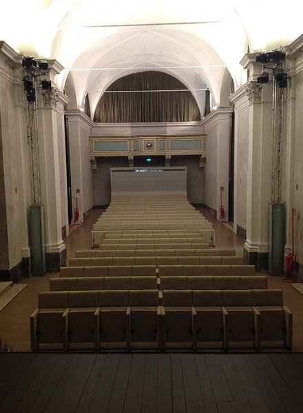 La platea contiene 174 posti. Il palcoscenico ha una dimensione di m 7.00 x 10,50 per un altezza utile di m 5,50, con declivio del 4% circa.